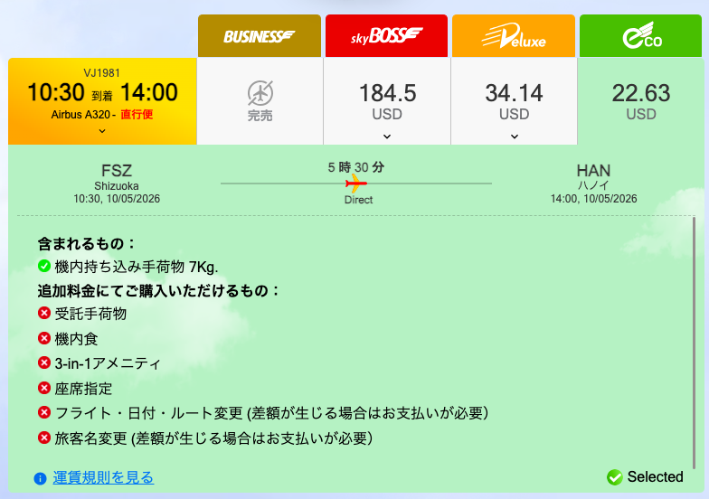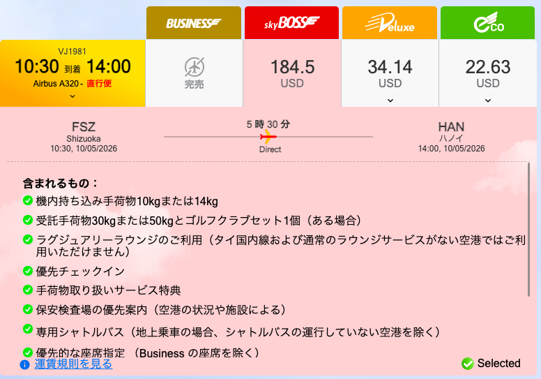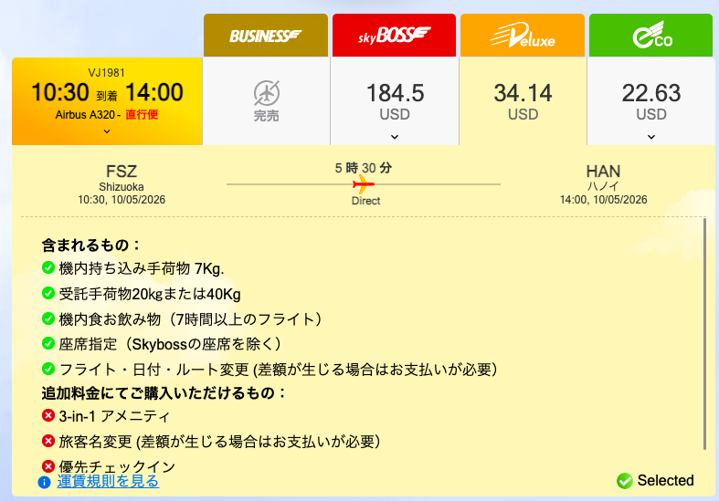 静岡-ハノイの2026.5月の料金↓